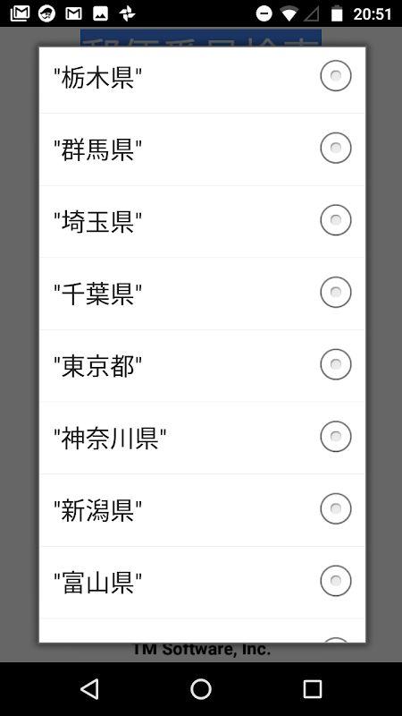 * アプリを起動します。初回起動時はデータベース初期化のために都道府県メニュー表示に少し時間がかかります。2回目以降は即座に都道府県メニューを表示します。