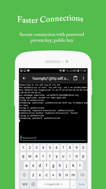 - Support ssh via private key, public key, tunnel network, pubkey authentication, ssh agent