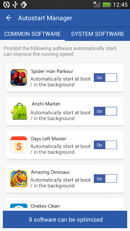 Prohibit the application start automatically, release memory, clean useless data, accelerate the speed of the system, and save power.