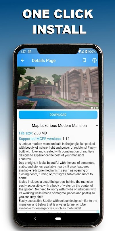 แผนที่ Redstone House ที่ทันสมัยซึ่งรวมถึงทุกคุณสมบัติที่คุณต้องการและมันก็ดูดีมาก! ในห้องใต้ดินคุณจะพบสถานีเกราะตู้เซฟเครื่องหยอดเหรียญและการสร้างสรรค์อื่น ๆ มันเป็นบ้านที่ดีมากที่จะใช้เป็นฐานสำหรับโลกแห่งการอยู่รอดของคุณเพราะมันรวมทุกอย่างไว้เพื่อให้คุณปลอดภัยจากสัตว์ประหลาดในตอนกลางคืนและเหมาะสำหรับการออกไปผจญภัยทุกวัน ที่ด้านหน้าของบ้านคุณสามารถเข้าถึงโรงจอดรถและคุณจะพบกับรถยนต์ที่แตกต่างกันมากมาย ไม่มีใครสามารถขับได้ แต่คุณสามารถใช้รถยนต์ addons สำหรับ mcpe: