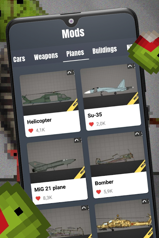 mod เครื่องบินสำหรับ Melon Playground เป็น mod ที่จะเพิ่มเครื่องบินให้กับเกมสนามเด็กเล่นแตงโมของคุณ มีการเพิ่มเครื่องบินและเฮลิคอปเตอร์หลายประเภทในสนามเด็กเล่นของดีแลน การผจญภัยของคุณจะกลายเป็นเรื่องที่น่าตื่นเต้นมากขึ้นด้วยเครื่องบินและเฮลิคอปเตอร์รุ่นต่อไป: Su-35, MiG-21, Bomber, Mi-28n, เครื่องบินธรรมดาและเฮลิคอปเตอร์ และอื่นๆ
