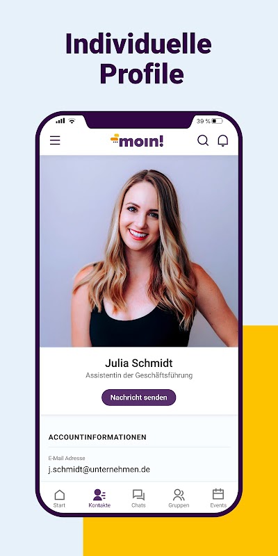 สวัสดี! เป็นเรื่องง่าย คำแนะนำผู้ใช้ที่ใช้งานง่ายช่วยให้ผู้ใช้ที่ไม่มีความรู้ด้านไอทีมาก่อนสามารถทำได้โดยไม่มีปัญหากับ moin! เริ่ม. นอกจากความเรียบง่ายแล้ว โฟกัสอยู่ที่ความปลอดภัย เพราะตรงกันข้ามกับเครื่องมือแชทชื่อดังของอเมริกา ข้อมูลจาก moin! ในเยอรมนีบนเซิร์ฟเวอร์ที่ได้รับการรับรองมาตรฐาน ISO