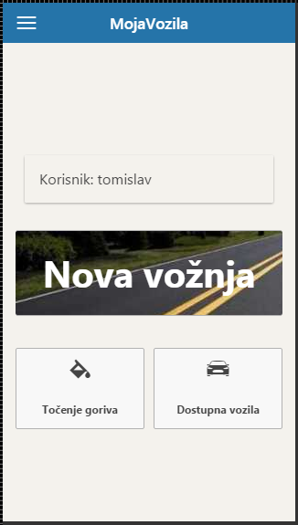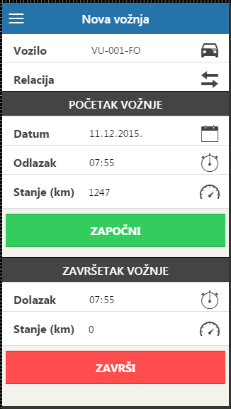Novu loko vožnju započinjete klikom na "Nova vožnja". Vozilo možete odabrati iz padajućeg izbornika. Zadnja kilometraža odabranog automobila automatski se dodaje u formu za novu vožnju, a možete ju i samostalno promijeniti ako je potrebno.