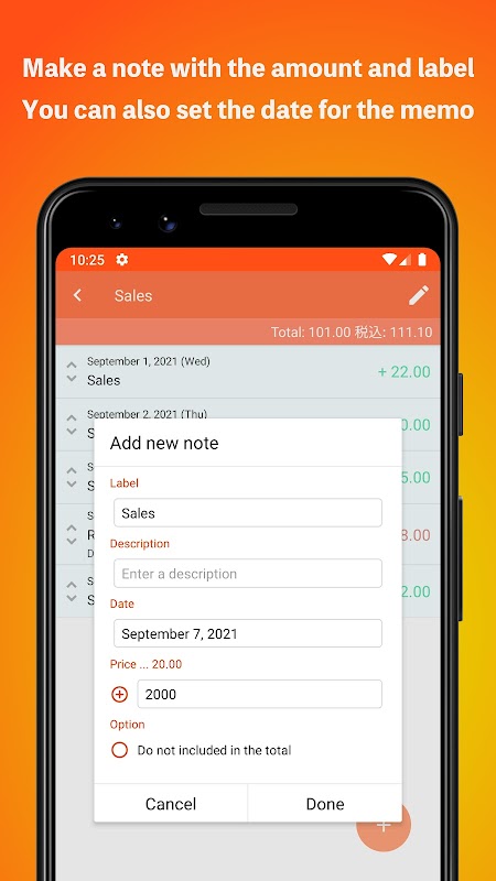 คุณสามารถจดบันทึกเงินได้เพียงแค่ป้อนจำนวนเงินและป้ายกำกับ