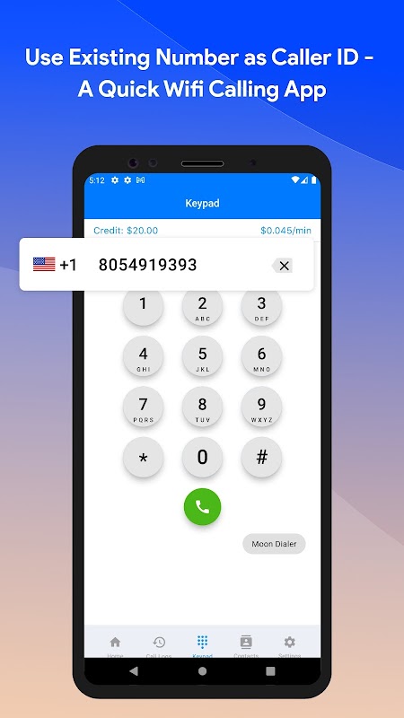 คุณสามารถโทรออกโดยใช้ข้อมูลมือถือหรือการเชื่อมต่ออินเทอร์เน็ต WiFi เมื่อเครือข่ายเหลือน้อย นอกจากนี้ คุณยังสามารถใช้หมายเลขเซลล์ปัจจุบันของคุณเป็นหมายเลขผู้โทรของคุณได้ ด้วย Moon Dialer คุณสามารถเริ่มบันทึกได้เช่นกัน