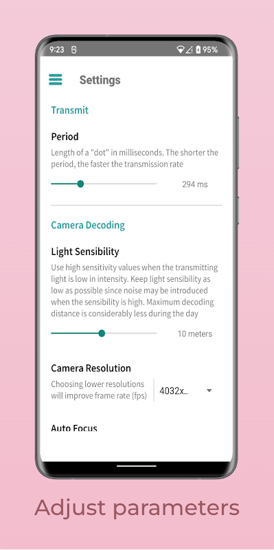 วงกลม. หากแสงกระพริบที่ความถี่ที่เร็วหรือช้าเกินไป (ใช้การตั้งค่าการส่งเริ่มต้นเป็นการเปรียบเทียบ) คาดว่าจะสูญเสียอักขระ 2 ตัวแรก แต่หลังจากนั้นอัลกอริทึมการถอดรหัสจะปรับตัวเองให้เข้ากับความถี่ใหม่และคุณจะสูญเสีย ไม่มีอักขระเพิ่มเติม การตั้งค่าใหม่นี้จะถูกบันทึกไว้ตราบใดที่คุณยังอยู่ในแอพ หยิกซูมยังมีอยู่