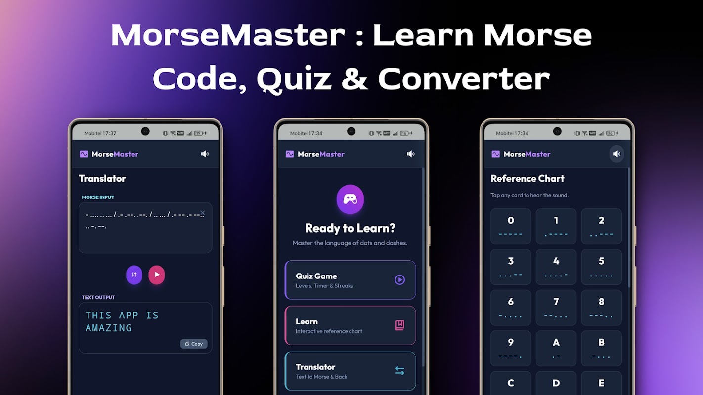 Morse Code Translator & Quiz คือเครื่องมืออัจฉริยะแบบครบวงจรที่ให้คุณแปล ฝึกฝน และฝึกฝนรหัสมอร์สอย่างเชี่ยวชาญในรูปแบบที่สนุกสนานและโต้ตอบได้ ออกแบบด้วย UI ที่ทันสมัยและใช้งานง่าย เหมาะสำหรับผู้เริ่มต้น ผู้เรียน ผู้ที่สนใจวิทยุ และผู้ที่รักปริศนาที่ต้องการเครื่องมือแปลที่รวดเร็วพร้อมเกมตอบคำถามในตัว