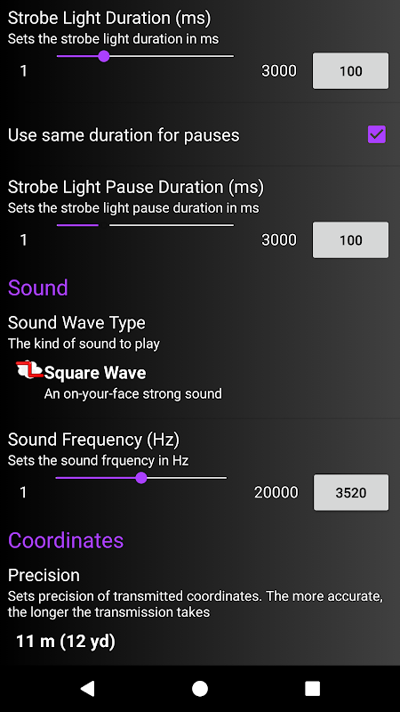 It’s preset with the most audible sound and everything is fully customizable, from sound frequency and type to Morse cadence, strobe light interval and even GPS location coordinates precision!