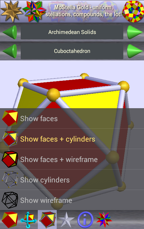 ไปโฆษณาฟรีกับ MoStella เงินหรือทอง MoStella เพิ่มเงินส่วนที่เหลืออีก 54 รูปทรงหลายเหลี่ยมชุดที่ไม่นูนออกมาและการสะสมของปริซึมสม่ำเสมอและ antiprisms MoStella ทองเพิ่มหลายร้อยรูปทรงหลายเหลี่ยมอื่น ๆ รวมทั้งจอห์นสันของแข็งใกล้คิดถึง stellations สารประกอบทรงกลมเนื้อที่สจ๊วต toroids และอื่น ๆ