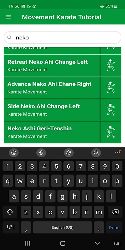 แอพนี้ "สอนคาราเต้แบบเคลื่อนไหว" มีการฝึกคาราเต้แบบเคลื่อนไหวทั้งขั้นพื้นฐานและขั้นสูงกว่า 70 แบบที่คุณสามารถเรียนรู้ได้ด้วยตัวเองที่บ้าน บทช่วยสอนคาราเต้บางส่วนที่จัดทำโดยแอพนี้คือ: