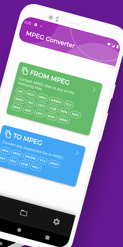 แอปพลิเคชั่นแปลงนี้ให้คุณแปลงไฟล์วิดีโอ MPEG เป็นไฟล์อื่น ๆ เช่น GIF, MOV, MKV, WEBM, FLV, WMV, AVI, OGV, VOB และ MP4 นอกจากนี้ยังสามารถแปลงไฟล์อื่นเป็น MPEG