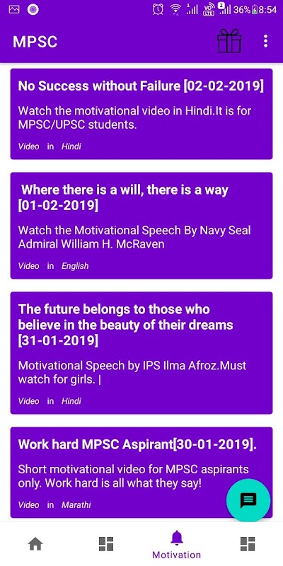 App also provides motivational videos to stay on track always. So whenever needed , aspirant can have the motivation back. Daily one motivation video is added in the list. User gets the notification daily once the video is added.