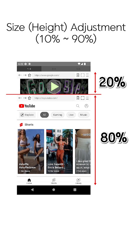 ระหว่าง 2 เบราว์เซอร์ (โหมดคู่) คุณสามารถควบคุมอัตราส่วนหน้าจอได้ 90%, 80%, 70%, 60%, 50%