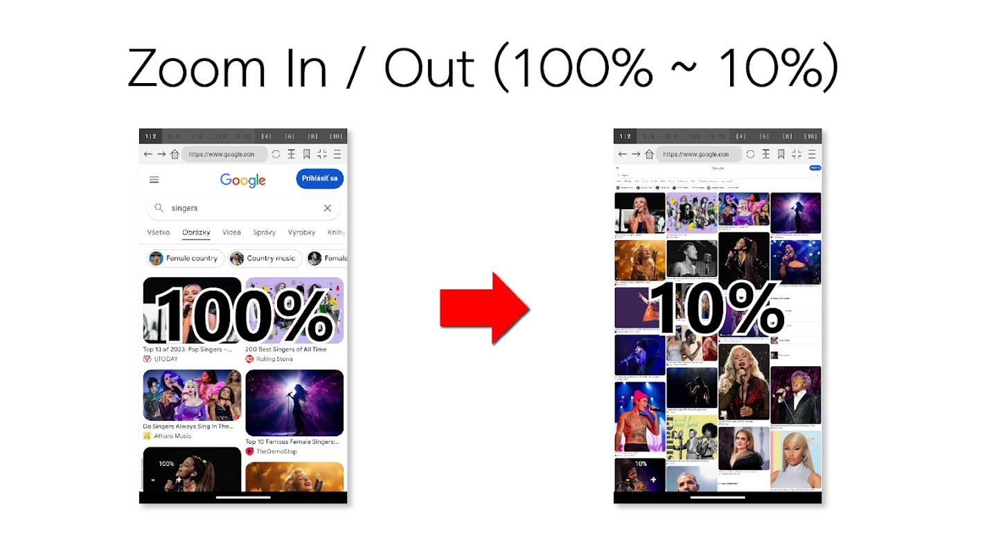 คุณสามารถควบคุมขนาดหน้าจอได้ตั้งแต่ 10% ถึง 200% และคุณสามารถแสดงหรือซ่อนปุ่มควบคุมขนาดหน้าจอได้ (ซูม -/+) นอกจากนี้คุณยังสามารถควบคุมเบราว์เซอร์ได้ 6 รายการพร้อมกัน
