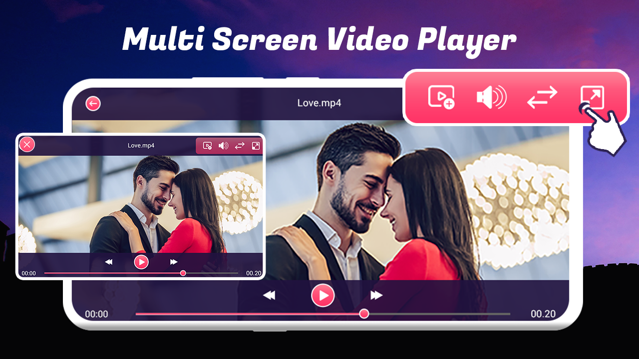 Multi Screen Video Player application also provide users to play gallery video on a single screen or it has one best thing to play video clip with Popup option. Popup screen adjustable in your mobile screen to adjust it with size and also a moveable option. the application also allows users to handle three videos at the same time like mute video clip, change the layout of the screen or also play or pause videos.