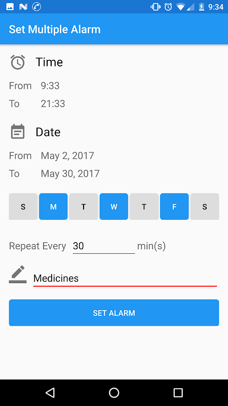 Multiple Alarms is an android application, to help its users to be on time for everything. It will help users to set reminders for important meetings, family functions, birthdays, parties, etc. Additionally, it will help them to set multiple alarms of a definite time interval. For example, a person on medications who needs to take medicines for about 5 times a day, after 3 hours of each dose of medicine. This application will help such kind of users by reminding them for taking medicines on time. Not only patients, but also students, professionals, people in sports can use this app and do things on time, without getting late. This application will help users while traveling as well. For users who are travelling can use this application for getting ready on time to catch a flight and reach their destination on time. It will also help them with creating a list of reminders about the events at the place they are visiting, and will help them to not miss any event, or function.