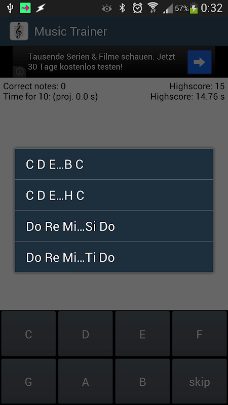 When pressing the 'skip' button, the correct note name is displayed for a moment. Press 'skip' again to move to the next note immediately.