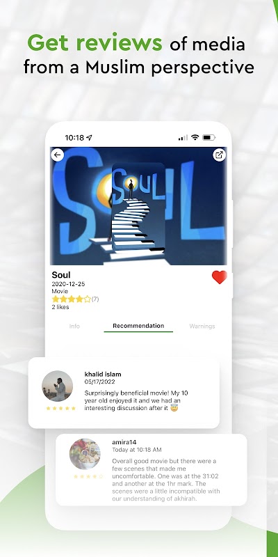 แอปชุมชนโซเชียลที่ช่วยให้คุณค้นพบคำแนะนำด้านสื่อจากผู้ที่มีค่านิยมแบบอิสลาม ค้นหาภาพยนตร์ หนังสือ รายการทีวี สตรีมซีรีส์ สารคดี พอดแคสต์ และอื่นๆ รับการวิจารณ์สื่อจากมุมมองของชาวมุสลิม แอปนี้จะช่วยให้คุณได้รับประโยชน์จากผู้อื่นโดยการแบ่งปันเนื้อหาที่เป็นประโยชน์และน่าสนใจแก่ผู้ใช้ทั่วโลก เป็นมิตรกับชาวมุสลิมเป็นแอปปฏิวัติวงการที่จะให้โฮมฟีดที่แสดงเฉพาะสิ่งที่คุณสนใจ รวมถึงฟอรัมชุมชนที่คุณสามารถขอคำแนะนำเฉพาะสำหรับผู้ใหญ่ เด็ก วัยรุ่น เด็กวัยหัดเดิน และอื่นๆ ติดตามผู้ใช้และเชื่อมต่อกับคำแนะนำของพวกเขา เข้าร่วมชุมชนวันนี้!