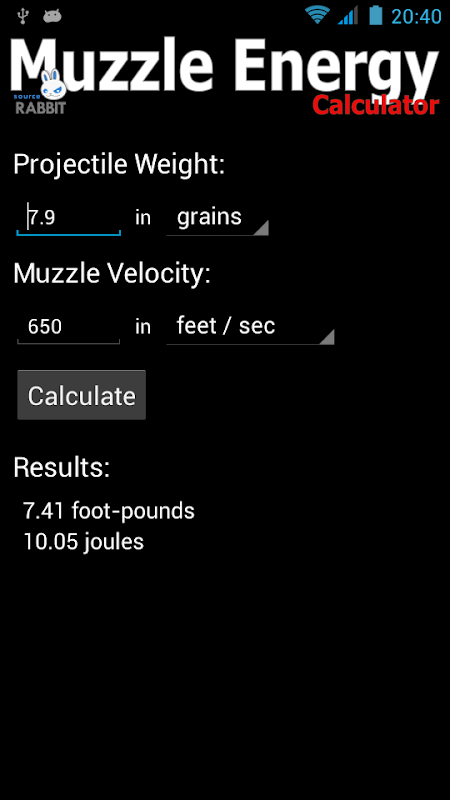 Easy and friendly App to calculate the muzzle energy for a projectile based on the mass and the velocity.