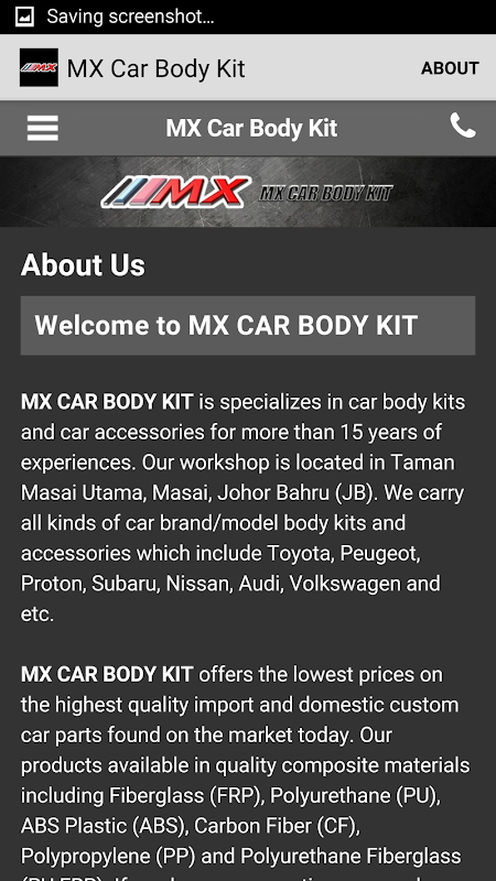 MX CAR KIT BODY เป็นความเชี่ยวชาญในชุดรถของร่างกายและอุปกรณ์เสริมในรถยนต์มานานกว่า 15 ปีของประสบการณ์ การประชุมเชิงปฏิบัติการของเราตั้งอยู่ใน Taman มาไซมา Utama, มาไซมา, ยะโฮร์บาห์รู (JB), มาเลเซีย เราดำเนินการทุกชนิดของรถยี่ห้อ / รุ่นชุดร่างกายและอุปกรณ์เสริมซึ่งรวมถึงโตโยต้า, เปอโยต์, โปรตอน, ซูบารุ, นิสสัน, ออดี้โฟล์คสวาเกนและอื่น ๆ
