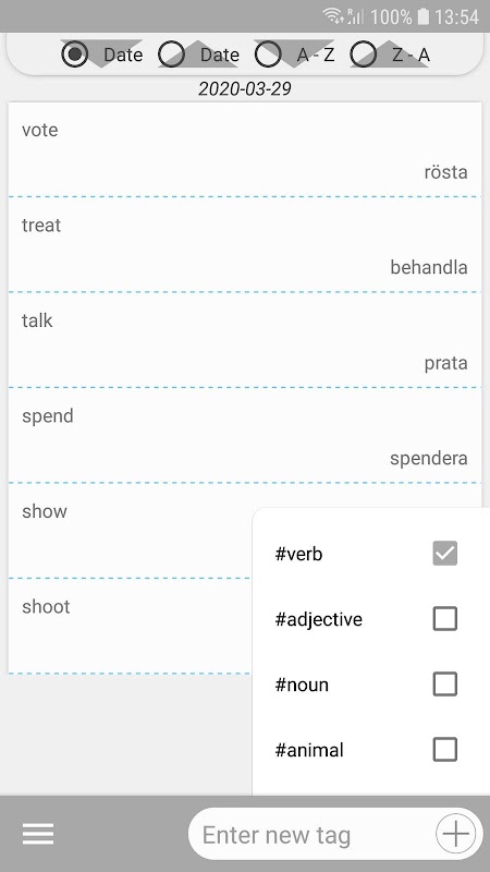 With this app it is easy to build vocabularies and learn many words when studying language. Enter thousands of words in two languages or one word in all languages you study. Words are stored at the touch of a button and can then be found easily through search or filtering if you choose to enter tags.