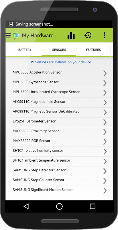 5. SENSORS: Number & Type of sensors varies device to device, it detects all the sensors list with their live changing values.