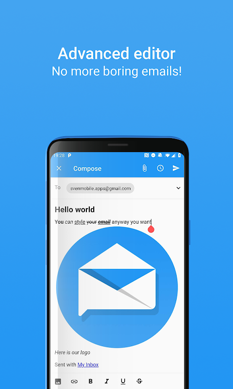 My Inbox is the best Android email client for Gmail. With My Inbox you will never lose track of your emails and attachments by simply organizing them into folders either by file type or your own folders. For the night owls between us we have added the dark mode feature.