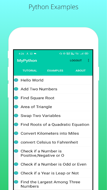 เรียนรู้แอพ Python จาก My python เป็นวิธีที่ง่ายกว่าในการเรียนรู้ Python ในระหว่างการเดินทาง กวาดนิ้วผ่านพื้นฐานและเรียนรู้การเขียนโค้ดตั้งแต่วันแรก สัมผัสประสบการณ์การเรียนรู้ด้วยมืออย่างสะดวกสบายด้วยโทรศัพท์ของคุณ รับแอปตอนนี้และเข้าถึงบทเรียนและตัวอย่างของ Python ฟรี