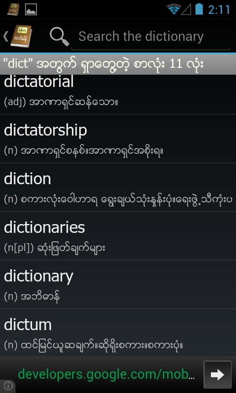 คำภาษาอังกฤษนอกจากนี้ยังสามารถมองขึ้นโดยการค้นหาด้วยคำพูดพม่า .... มองขึ้นย้อนกลับ ข้อความเป็นคำพูดคุณสมบัติของ Android จะใช้ในการฟังการออกเสียงของคำและคำพูดที่สามารถเก็บไว้เพื่ออ้างอิงในอนาคต เกมเรื่องไม่สำคัญยังมีการเพิ่มสำหรับผู้ที่ต้องการจะท้าทายตัวเอง