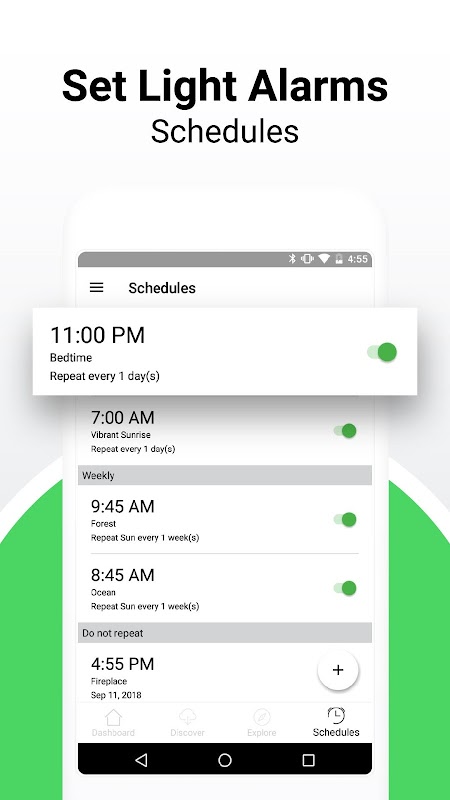 ตั้งค่าตารางเวลาเพื่อทำให้ความต้องการแสงในแต่ละวันของคุณเป็นไปโดยอัตโนมัติ ตั้งแต่การปลุกแสงยามเช้าที่อ่อนโยน ไปจนถึงการเตือนความจำในยามค่ำคืนที่ค่อยๆ หรี่แสงลงว่า Holy **** ตี 2 อีกครั้ง คุณต้องตื่นขึ้นในอีก 4 ชั่วโมง โปรดเข้านอน