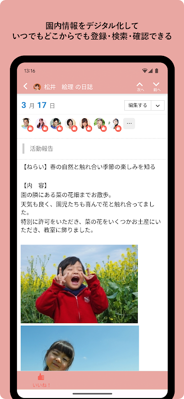 ผ่านกระดานข่าวที่ลงทะเบียน (ชุมชน) และไดอารี่ เจ้าหน้าที่ทุกคนสามารถเข้าใจสถานการณ์ในสวนได้อย่างรวดเร็ว (เนื้อหาของการประชุมเจ้าหน้าที่ เรื่องที่จะสื่อสาร สถานะของแต่ละชั้น ฯลฯ) ข้อมูลเดียวกันสามารถแบ่งปันกับพนักงานทุกคนได้แบบเรียลไทม์ ขจัดความไม่เสมอภาคของข้อมูลที่เกิดจากการทำงานเป็นกะและการไม่สามารถพบปะแบบเห็นหน้ากันหรือเข้าร่วมการประชุมหรือการฝึกอบรม ด้วยการแปลงข้อมูลที่จัดการในห้องพนักงานให้เป็นดิจิทัล เช่น รายงานการประชุมและบันทึกประจำวัน สามารถลดเวลาที่ต้องใช้ในการบันทึกด้วยลายมือได้ นำไปสู่การลดลงใน นอกจากนี้ การส่งข้อความส่วนตัวถึงกันและกันและการตอบสนอง (ไลค์และความคิดเห็น) เช่นบน SNS ทำให้เกิดการสื่อสารที่กระตือรือร้นระหว่างพนักงานมากขึ้น การทำให้เจ้าหน้าที่ทุกคนสามารถแบ่งปันข้อมูลเดียวกันได้ จะเป็นวิธีหนึ่งในการสร้างสภาพแวดล้อมที่ง่ายสำหรับพนักงานในการทำงาน เพื่อให้พวกเขาสามารถมุ่งเน้นที่กิจกรรมการศึกษาและการดูแลเด็กของเด็กๆ ได้มากขึ้น