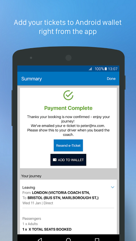 -Retrieve จองตั๋วของคุณบนเดสก์ทอป, แท็บเล็ตหรือโทรศัพท์มือถือที่จะใช้บนอุปกรณ์ของคุณหรือเพิ่มตั๋วโดยตรงในกระเป๋าสตางค์ของ Android ของคุณ