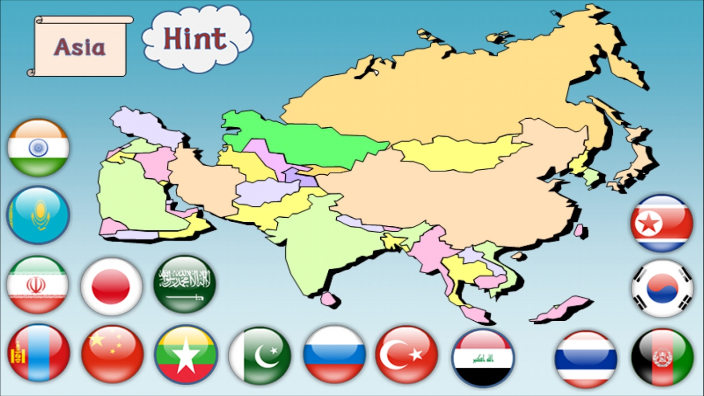 - Children can learn location and shape of major nations in each continent (Containing 75 nations).