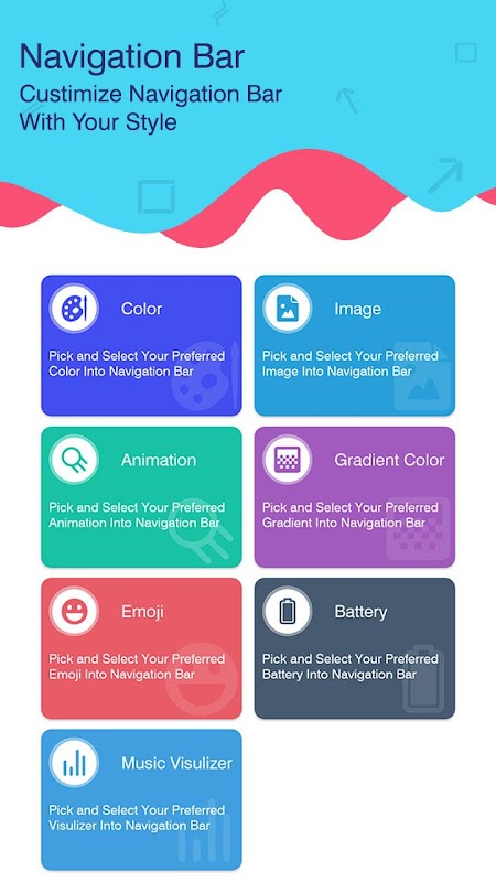 Navigation Bar Customization Simple to Attractive is a new-age app that is absolutely free to install and operate. Navigation Bar Customization Simple to Attractive app is easy to install and offers an easy-to-use functionality. Navigation Bar Customization Simple to Attractive app has professional and latest material design and carries out click quick executions. Navigation Bar Customization Simple to Attractive app supports all screen resolutions of mobile and tablet devices and is a lightweight application, will not drain the device memory, battery, other resources.