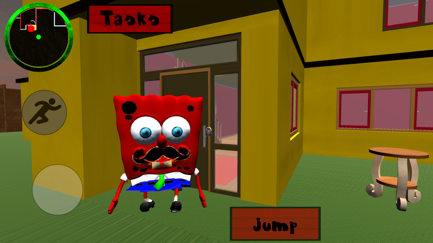 One day you discover some changes in the behavior of your Sponge Neighbor Bob! Often you see strange people with big bags near his house! Sometimes you hear some strange sounds, like cries and noises of fighting... And one dark night the sponge neighbor drags out of his house a bag with something that terribly reminiscent of the sponge body. It becomes clear that something terrible is happening. You can not stay away-you need to get into the neighbor's house and find out what's going on! However, this will not be so easy! But Don't be scared! Just say "Red Sponge , I am not afraid" or "Hello, Bob, you are bad Sponge"and challenge with him!