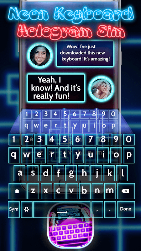 This keypad background is excellent for anyone who wants stand out in the crowd! Be it for jokes and pranks, or the neon glow keyboard on your device, everyone will notice you when you install our 🤡 Neon Keyboard Hologram Sim 🤡