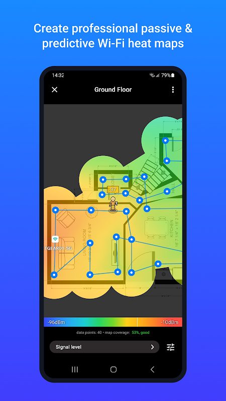 โหมดสำรวจ WiFi ของ NetSpot WiFi Heatmapper สำหรับ Android ช่วยให้คุณทำแผนที่ครอบคลุมพื้นที่ Wi-Fi ของคุณได้อย่างง่ายดายในเกือบทุกขนาด เพียงสร้างแผนที่โครงการใหม่พร้อมพื้นที่ว่าง โหลดภาพแผนที่ หรือถ่ายภาพบ้าน พื้น หรือแผนผังพื้นที่กลางแจ้งของคุณอย่างรวดเร็ว และเริ่มสร้างแผนที่ความร้อน WiFi แบบอินเทอร์แอคทีฟที่แสดงการแพร่กระจายสัญญาณไร้สายจริง NetSpot จะแนะนำคุณระหว่างการสำรวจพื้นที่ Wi-Fi เพื่อให้แน่ใจว่าจุดข้อมูลมีความหนาแน่นเหมาะสมที่สุด รวบรวมเมตริก WiFi ต่างๆ และจัดทำแผนที่เครือข่ายไร้สายของคุณในขณะที่คุณเคลื่อนที่ จัดระเบียบการสำรวจพื้นที่ Wi-Fi / แผนที่ความร้อน Wi-Fi ของคุณในหลายโซน โดยเพิ่มจุดข้อมูลได้ไม่จำกัดจำนวน เพื่อให้ได้พื้นที่ครอบคลุม Wi-Fi ที่สมบูรณ์แบบและแผนที่สัญญาณ Wi-Fi ที่ครอบคลุม