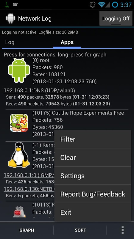 Network Log monitors iptables-logging to display a real-time list of which apps are making network connections, and provides statistics about those app connections.