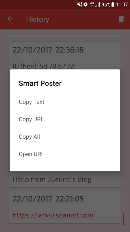 ในการใช้ NFC Reader คุณต้องถือแท็กหรือการ์ดไว้ด้านหลังอุปกรณ์ของคุณเพื่ออ่าน NFC Reader ช่วยให้คุณสามารถคัดลอกเนื้อหาของแท็กหรือเพื่อเปิด URI นอกจากนี้คุณยังสามารถจัดการแท็กและการ์ดที่สแกนก่อนหน้านี้ได้ในส่วนประวัติ
