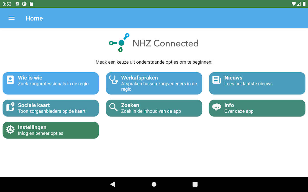 แอปที่เชื่อมต่อ North Holland South (NHZ) เกิดจากการริเริ่มของ Medical Coordinating Center (MCC) Haarlem en Meer แนวคิดของแอปนี้คือผู้ให้บริการดูแลในภูมิภาค (บรรทัดที่ 1 และ 2) สามารถค้นหาและติดต่อกันได้ง่ายขึ้นเพื่อส่งเสริมความร่วมมือซึ่งกันและกัน แอปและเว็บไซต์ที่ให้มา (www.nhz-connected.nl) เป็นแพลตฟอร์มข้อมูลระดับภูมิภาคสำหรับสิ่งนี้