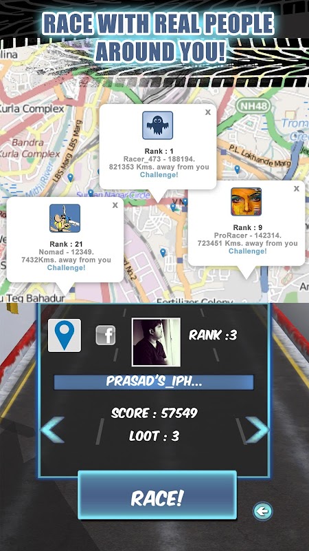 A race isn't a race with no challenger. Welcome to the next level of multiplayer racing; you can now challenge racers around you using your phones geo-location. Beat them to the score and dominate your presence on the map.
