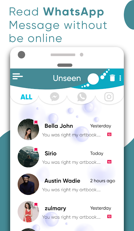 ตอนนี้ซ่อนการเห็นล่าสุดด้วย "ไม่พบครั้งสุดท้ายและดูข้อความที่ถูกลบ - แอปที่มองไม่เห็น" บน WhatsApp อ่านข้อความโดยไม่มี Blue Tick โดยไม่ต้องแสดงให้ใครเห็นว่าคุณกำลังอ่านข้อความลบด้วยแอพ Unseen Free นี้ หากมีคนส่งข้อความใน WhatsApp และลบทิ้งคุณยังสามารถอ่านข้อความใน "ไม่เห็นครั้งสุดท้ายดูข้อความที่ถูกลบ - แอปที่มองไม่เห็น" ได้ฟรี ซ่อนสถานะออนไลน์ WhatsApp ของคุณและขีดสีน้ำเงินพร้อมกู้คืนข้อความทั้งหมดในแอพที่มองไม่เห็นฟรีนี้ อ่านข้อความด้วย Unseen Messenger บนโทรศัพท์มือถือของคุณ