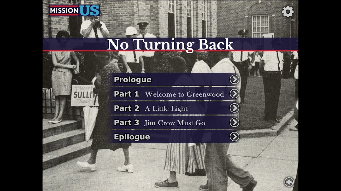“No Turning Back” ซึ่งได้รับรางวัลเหรียญทองจาก International Serious Play Awards เป็นส่วนหนึ่งของซีรีส์โต้ตอบ MISSION US ที่ได้รับการยกย่อง ซึ่งให้เยาวชนได้ดื่มด่ำไปกับเรื่องราวอันน่าทึ่งในประวัติศาสตร์อเมริกัน จนถึงปัจจุบันมีนักเรียนมากกว่าสี่ล้านคนใช้ Mission US จากการศึกษาวิจัยหลายชิ้นพบว่าการใช้ Mission US ช่วยเพิ่มพูนความรู้และทักษะด้านประวัติศาสตร์ ช่วยให้นักเรียนมีส่วนร่วมมากขึ้น และส่งเสริมให้นักเรียนได้สนทนาในชั้นเรียนอย่างเข้มข้นมากขึ้น