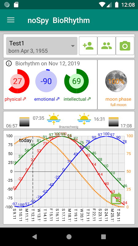 การคำนวณเส้นทางของ biorhythms ทั้งสามทางร่างกายอารมณ์และสติปัญญารวมถึงระยะของดวงจันทร์ ค่ารายวันส่วนบุคคลที่คำนวณได้จะแสดงในแผนภูมิวงกลม