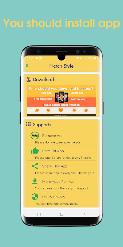 "Notch Remove" อนุญาตให้ลบรอยบากหยดน้ำบนอุปกรณ์ Android: Huawei P50, P40, P30, P20, Mate 50, Mate 40, Mate 30, Mate 20, Oppo F9, Mi 11, Mi 10, Galaxy S22, S21 , S20, S10, Galaxy Note 21, Note 20, Note 10, Galaxy M20, M31, M51, M71, Galaxy A72, A71, A52, A51, A32, A31, A22, A21, Vivo X23, Zenfone 5, เกียรติยศ 8X Max , ... และ Phone X อื่นๆ, สมาร์ทโฟน Android ที่คล้ายกับ Phone XI