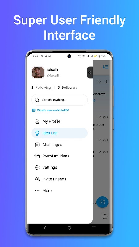 NotePD เป็นแพลตฟอร์มการเขียนออนไลน์ที่ดีที่สุดสำหรับการแบ่งปันและรับข้อเสนอแนะเกี่ยวกับแนวคิดของคุณ คุณสามารถติดตามผู้ใช้รายอื่นและดูรายการไอเดียของพวกเขาในฟีดของคุณได้ นี่เป็นวิธีที่ยอดเยี่ยมในการรับแรงบันดาลใจจากผู้ใช้รายอื่นและช่วยเหลือพวกเขาด้วยการให้ข้อเสนอแนะเกี่ยวกับแนวคิดของพวกเขา NotePD เป็นวิธีที่ยอดเยี่ยมในการปรับปรุงความคิดสร้างสรรค์ ประสิทธิภาพการทำงาน และทักษะการแก้ปัญหาของคุณ เข้าร่วมชุมชนนักเขียน Idea-list วันนี้!