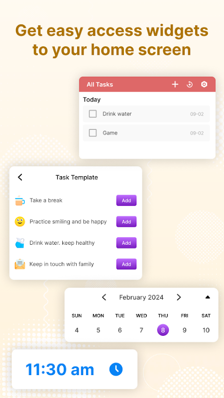 เข้าถึงรายการสิ่งที่ต้องทำของคุณทุกที่ทุกเวลาด้วยวิดเจ็ตที่มีประโยชน์ของเรา เพิ่มวิดเจ็ตลงในเดสก์ท็อปของโทรศัพท์เพื่อการเข้าถึงงานประจำวันของคุณอย่างรวดเร็วและง่ายดาย ทำเครื่องหมายงานว่าเสร็จสมบูรณ์ได้โดยตรงจากวิดเจ็ต ทำให้การติดตามความคืบหน้าเป็นเรื่องง่าย