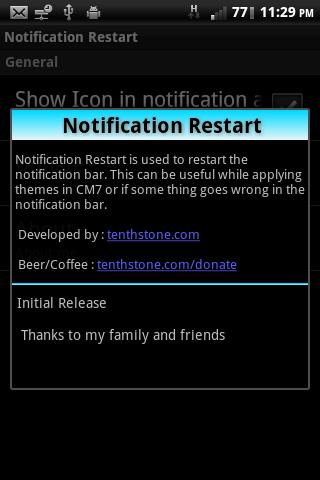 Notification Restart can be used to restart the notification bar(status bar). This can be useful while applying themes in CM7 and the status bar is not updated with the theme.