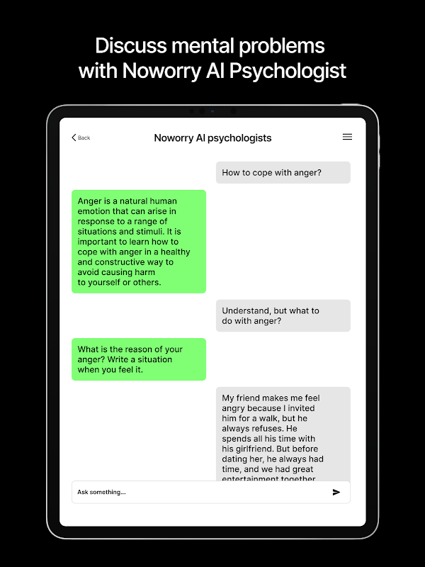 The other option is to ask for help from Noworry's AI psychologist. Just write a request in the chat, whether it's about relationship problems or other mental issues, and the AI will solve it.