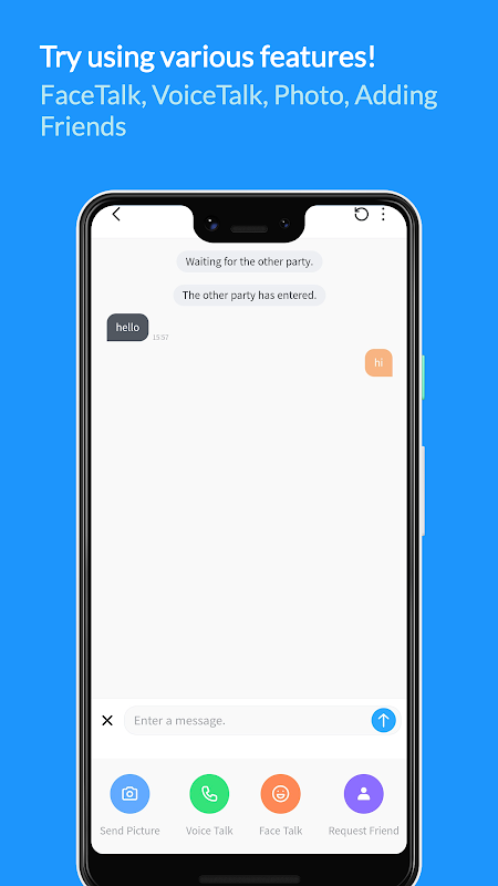 เริ่มแชทแบบสุ่มทันทีที่อนุญาตให้แฮงเอาท์วิดีโอ โทรศัพท์ แบ่งปันรูปภาพ และแม้แต่เพิ่มเพื่อน! เพลิดเพลินไปกับประสบการณ์แปลกใหม่และความสนุกสนานผ่านการพบปะผู้คนมากมาย!